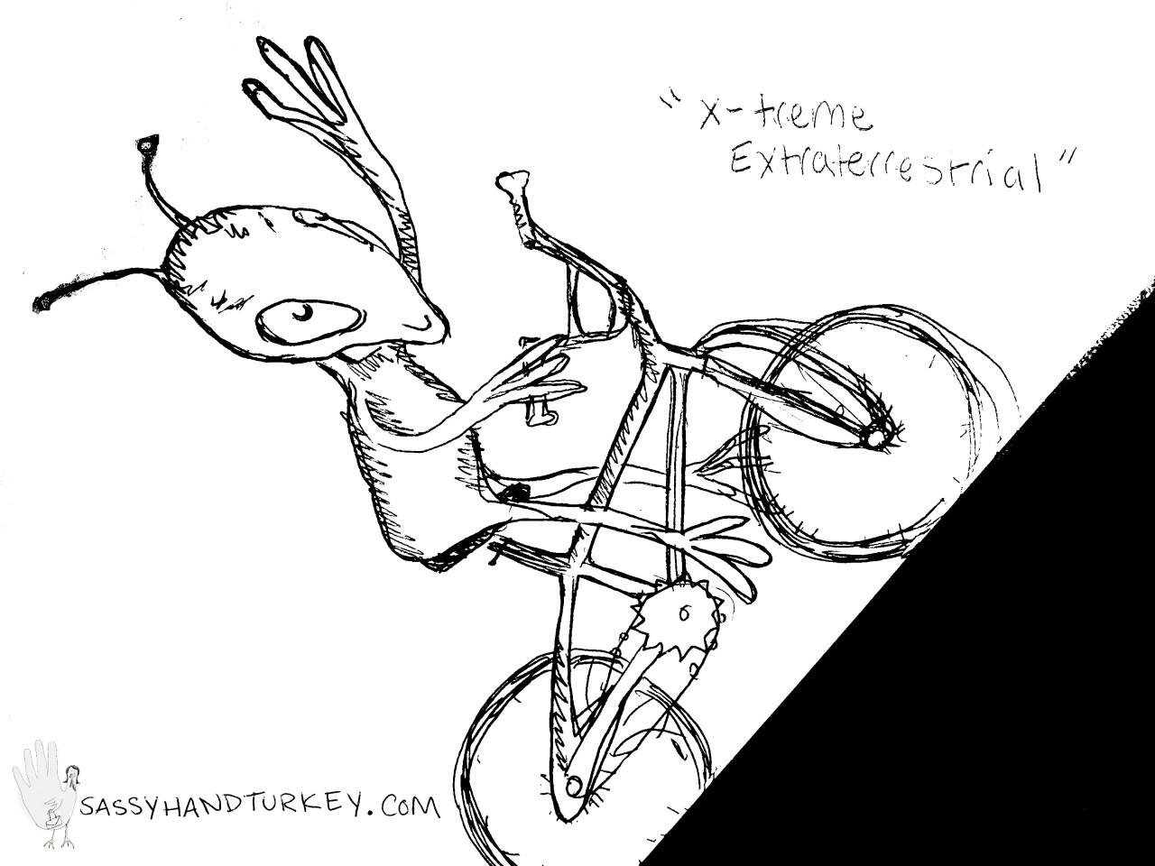 Extreme Extraterrestrial Date: June 19, 2012Author: alexandriaska Category: Monsters, Transportation Tags: alien, bmx, cartoon, doodle, drawing, extraterrestrial, extreme sports, humor Post navigation ← Zombie Kitty Loves Bath Salts Anchor Man → Share this: Share on Facebook (Opens in new window) Facebook Share on Pinterest (Opens in new window) Pinterest Share on Tumblr (Opens in new window) Tumblr Share on X (Opens in new window) X Like Loading... Related